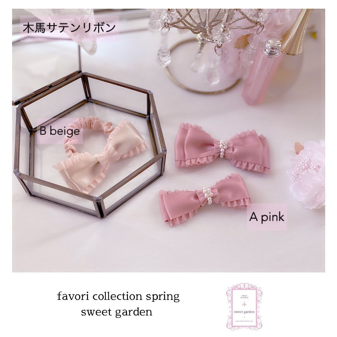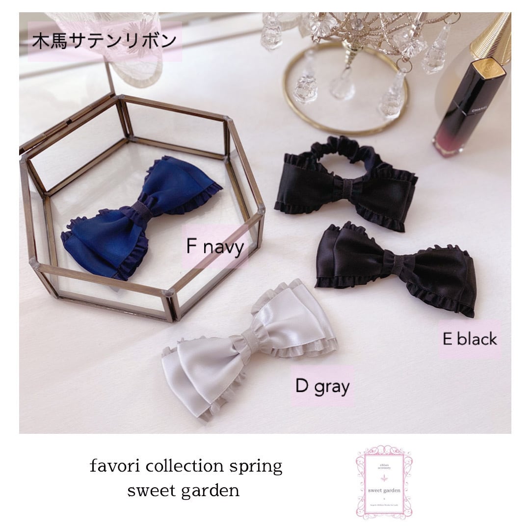 上質な木馬グログランリボン、木馬サテンリボンでお作りした繊細なフリルがポイントのリボンヘアアクセサリーです。